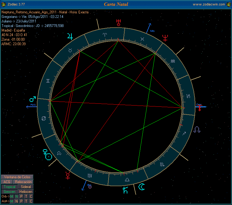 Neptuno invertirá su movimiento a retrógrado proximamente, en concreto el próximo 3 de Junio y retornará a Acuario, el signo desde el que se ha asomado brevemente a Piscis (hizo su ingreso el pasado 4 de Abril), el día 5 de Agosto, cuando Neptuno estará llamando de nuevo a las "Puertas de Acuario" desde 0º Piscis, en donde no volverá hasta su reingreso definitivo, allá por el 3 de Febrero de 2012. Pensamos que esta inversión de movimiento de Neptuno en primera instancia va a procurar el abandono de parte de la protesta, en el sentido de desalojo voluntario (parcial ó total, aunque creemos más posible la primera de las dos opciones ) de los "santuarios" del Movimiento.